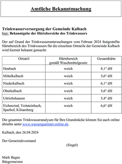 Der auf Grund der Trinkwasseruntersuchungen vom Februar 2024 festgestellte Härtebereich des Trinkwassers für die einzelnen Ortsteile der Gemeinde Kalbach wird hiermit bekannt gemacht: