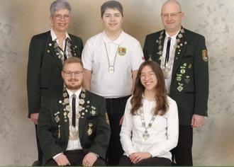 ( Stehend von links ) 2. Ritterin Manuela Weiß, 1. Jugend Ritter Erik Nahrung, 1. Ritter Michael Aland, ( sitzend von links Schützenkönig Fabian Sembach, Jugendkönigin Luisa Nahrung