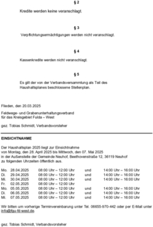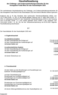 Die nachstehende Haushaltssatzung des Feldwege- und Grabenunterhaltungsverbandes für das Kreisgebiet Fulda-West für das Haushaltsjahr 2025 wird hiermit öffentlich bekannt gemacht.