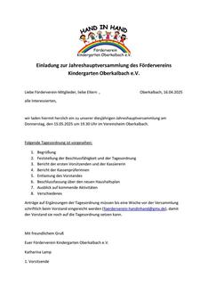 Einladung zur Jahreshauptversammlung des Fördervereins Kindergarten Oberkalbach e.V.