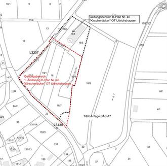 hier: Lage B-Plan Nr. 40 „Gewerbegebiet - Kirschenäcker“ OT Uttrichshausen mit Kennzeichnung der 1. Änderung des B-Planes Nr. 40, genordet ohne Maßstab