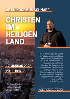 Unter dem Titel „Christen im Heiligen Land“ wird er am 17.01.2026 um 20.00 Uhr im Pfarrheim Flieden über die aktuelle Situation im Heiligen Land berichten. Wir laden Sie herzlich zu diesem Vortrag und dem Gespräch mit Abt Nikodemus Schnabel ein. Der Eintritt ist frei, wir bitten um eine Spende für die Aufgaben von Abt Nikodemus im Heiligen Land.