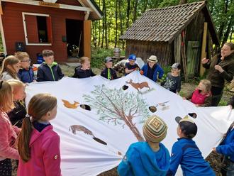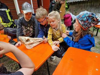 Nach der kreativen Bauphase kehrte die Gruppe zur Schwedenhütte zurück. Dort präsentierte die Försterin eine spannende Sammlung aus Geweihen, Fellen und Knochen von Wildtieren. Gespannt lauschten die Kinder den Erklärungen über die heimische Tierwelt und durften die Materialien aus nächster Nähe betrachten – eine Erfahrung, die großes Staunen hervorrief.