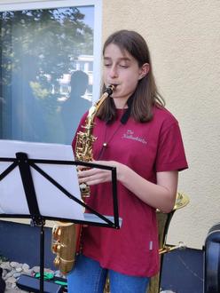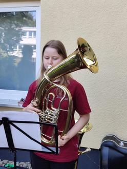 In dieser suchte der Bär Ferdinand nach „seinem Ton“ und fragte dafür viele seiner tierischen Freunde. Alle beherrschten ein Instrument und übten schon fleißig für das bevorstehende Geburtstagsfest. Um den 5-8 jährigen Kindern nicht nur die Namen der Instrumente vorzulesen sondern ihnen auch ein Gefühl für das jeweilige Instrument und dessen Klang zu geben wurde die Aktion zusammen mit der Jugendgruppe der Kalbachtaler durchgeführt. Dazu hatten einige junge Musikerinnen und Musiker extra Kinderlieder einstudiert. Durch kurzfristige Ausfälle sprangen am Veranstaltungstag noch einige Erwachsene ein, damit auch jedes Instrument, das in der Geschichte vorkommt, gespielt werden konnte. Und so erklangen an diesem Nachmittag Tuba, Flöte, Trompete, Klarinette, Saxofon und Tenorhorn vor der Bücherei. Die Kinder hörten begeistert den Musikstücken zu und konnten die Lieder sogar benennen. Auch das Vervollständigen der Reime aus der Geschichte machte den Kindern viel Spaß.