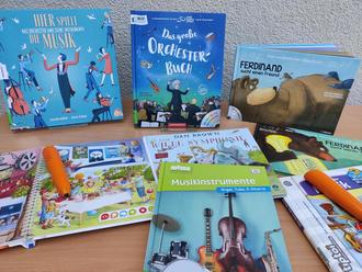 Im Anschluss wurde noch der passende Büchertisch in Augenschein genommen, auf dem sich viele Bücher zum Thema Musik fanden. Neben Kindersachbüchern und Bilderbüchern und auch 2 Tiptoi-Bücher. Aus einem wurde zum Abschluss noch ein Rätsel mit den Kindern gespielt.