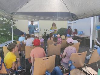 An Pfingstsamstag veranstaltete die Bücherei Mittelkalbach eine musikalische Lesung für Kinder. Aufgrund des guten Wetters fand die Aktion vor der Bücherei statt. 20 Kinder hatten sich für die Veranstaltung angemeldet und lauschten gespannt der Geschichte.