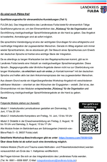 Da es allerdings zu langen Wartezeiten bei den Regelsprachkursen kommt, gibt es im Landkreis Fulda bereits eine Vielzahl an niedrigschwelligen Sprachlernangeboten. Diese Sprach-, Begegnungscafés oder ähnliche Angebote dienen nicht nur zur Überbrückung von langen Wartezeiten, sie erleichtern auch ein erstes „in Kontakt kommen“ mit der deutschen Sprache und helfen aktiv bei dem Ankommensprozess der neu zugewanderten Menschen.