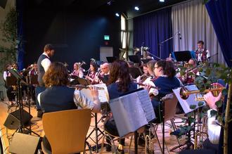 Die Blaskapelle RSM bot ein vielseitiges Reportoire. Traditionelle Blasmusikstücke luden die Leute zum Schunkeln und Mitsingen ein. Mit aktuellen Blasmusiktiteln und einigen modernen Liedern schafften sie es, das Publikum von Jung bis Alt im vollen Bürgerhaus zu begeistern.