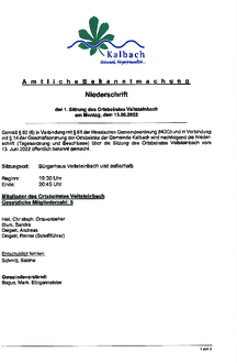 Gemäß § 82 (6) in Verbindung mit § 61 der Hessischen Gemeindeordnung (HGO) und in Verbindung mit § 14 der Geschäftsordnung der Ortsbeiräte der Gemeinde Kalbach wird nachfolgend die Niederschrift (Tagesordnung und Beschlüsse) über die Sitzung des Ortsbeirates Veitsteinbach vom 13. Juni 2022 öffentlich bekannt gemacht.