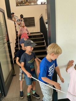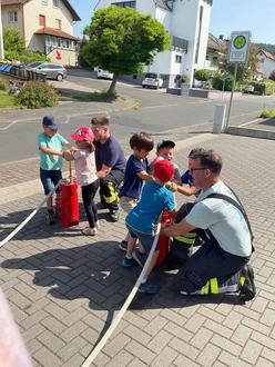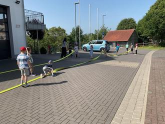 Nach einem gemeinsamen Frühstück ging es dann nach draußen. Hier hatten die Feuerwehrleute verschiedene Spiele vorbereitet, die den Kindern einen Feuerwehreinsatz kindgerecht näherbringen sollten. So durften sie zum Beispiel mit einem Schlauch in Eimer zielen bis diese voll waren. Die Kinder trainierten Zusammenhalt und Teamwork, da das Wasser zeitgleich in die Schläuche gepumpt werden musste, um genug Druck zum Spritzen zu erzeugen. Die Feuerwehrleute zeigten den Kindern wie sie sich bei schlechter Sicht beispielsweise durch Rauch anhand eines Seils durch ein Gebäude orientieren können.