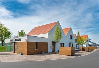Ein weiterer Gewinner aus dem Wettbewerb 2021: Am Ortsrand von Dipperz hat Dr. Hölper eine Wohnhausbebauung mit drei Wohngebäuden, einer Arztpraxis sowie einer Garage mit vier Stellplätzen errichtet. Die drei Wohngebäude sind als Einfamilienhäuser errichtet worden. Staffelung der Baukörper, weißer Außenputz, rote Ziegel und Holzverkleidung: Der Gebäudekomplex ist typisch für die Region.