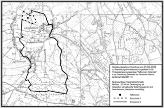 Im Staatsanzeiger für das Land Hessen Nr. 17/2025 vom 21. April 2025 S. 514 ff. wurde die Verordnung zur Festsetzung eines Wasserschutzgebietes für die Trinkwassergewinnungsanlage „Tiefbrunnen Eichenried“ in der Gemarkung Eichenried der Gemeinde Kalbach, Landkreis Fulda vom 24. Februar 2025 verkündet. Die Grenzen des Schutzgebietes sind aus der nachfolgenden Orientierungskarte zu ersehen.