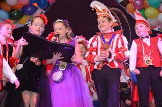 Pünktlich um 13:01 Uhr marschierten Kinderprinz Paul „von Tennis und Gitarrenhit, hält sich auch mit Fußball fit" (Paul van Driel) mit seiner Lieblichkeit Kinderprinzessin Ida „das Energiebündel von Turn und Sport, Meisterin vom flotten Wort" (Ida Diegmüller) und ihre Adjutanten Lotta (Diegmüller), Julia (Klauschke) sowie Oscar (Rücker) in das Bürgerhaus ein und begrüßten die Kinder aus Kalbach und der Region. Lioba Werner und Jasmina Niedling führten zusammen mit Clown Elias Mack schwungvoll durch das Kinderprogramm für jeden Geschmack, welches die Narrenzunft Mittelkalbach auf die Beine gestellt hatte. Der Nachmittag mit Spiel, Spaß und Musik wurde von den „Smarties“ eröffnet, die die Herzen der Zuschauer sofort eroberten. Dicht dahinter präsentierte die kleine Garde des CC Döngesmühle ihren Tanz, worauf sich die erste Tanzrunde des bunt verkleideten Publikums anschloss. Es folgten die „Piccolinas“ und die Tänzerinnen des GV Schweben und der KG Neuhof mit ihren kreativen Darbietungen. Nach der zweiten Tanzrunde boten die befreundeten Vereine aus Hauswurz und Niederkalbach ihre toll einstudierten Gastgeschenke dar. Im Anschluss sorgte eine weitere Tanzrunde für super Stimmung. Höhepunkt für die kleinen Karnevalisten war sicherlich der Luftballonregen von der Decke der geschmückten Narhalla, bevor gegen 16:30 Uhr das Kinderprinzenpaar mit seinem Gefolge von der Bühne ausmarschierte.