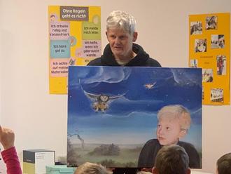 Ende November durften wir dann im Rahmen der Reihe "Literatur im November" den Autor Christoph Schellenberg an unserer Schule begrüßen. Er las aus seinem Buch "Yorsch und der Geist der Berge" vor. Die Kinder begaben sich mit dem Jungen Yorsch auf ein spannendes Abenteuer in die Welt der Berge. Dort sollte er eine rettende Medizin für seine Mutter besorgen. Ein gefährlicher Weg führte ihn über Schnee, Eis und Gletscher... Christoph Schellenberg verstand es, die Kinder zu unterhalten, zwischendurch zu erzählen und die Textstellen so auszuwählen, dass die Kinder das Abenteuer von Yorsch "miterleben" konnten. Am Ende der Lesung stellten die Kinder noch zahlreiche Fragen an den Autor.