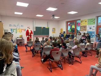 Am 6. Dezember schaute der Nikolaus in der Schule vorbei. Die Schülerinnen und Schüler begrüßten ihn mit dem Lied "Sei gegrüßt, lieber Nikolaus". In seinem goldenen Buch stand viel Lobenswertes, er verteilte aber auch einige Ermahnungen an die Klassen. Zum Abschluss hatte er für jedes Kind eine kleine Überraschung dabei, die der Förderverein vorbereitet hatte. Herzlichen Dank dafür!