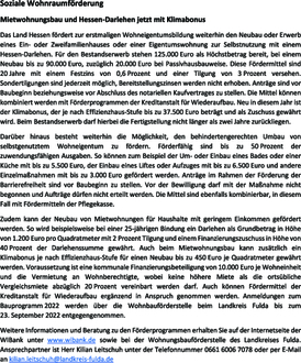 Zudem kann der Neubau von Mietwohnungen für Haushalte mit geringem Einkommen gefördert werden. So wird beispielsweise bei einer 25-jährigen Bindung ein Darlehen als Grundbetrag in Höhe von 1.200 Euro pro Quadratmeter mit 2 Prozent Tilgung und einem Finanzierungszuschuss in Höhe von 40 Prozent der Darlehenssumme gewährt. Auch beim Mietwohnungsbau kann zusätzlich ein Klimabonus je nach Effizienzhaus-Stufe für einen Neubau bis zu 450 Euro je Quadratmeter gewährt werden. Voraussetzung ist eine kommunale Finanzierungsbeteiligung von 10.000 Euro je Wohneinheit und die Vermietung an Wohnberechtigte, wobei keine höhere Miete als die ortsübliche Vergleichsmiete abzüglich 20 Prozent vereinbart werden darf. Auch können Fördermittel der Kreditanstalt für Wiederaufbau ergänzend in Anspruch genommen werden. Anmeldungen zum Bauprogramm 2022 werden über die Wohnbauförderstelle beim Landkreis Fulda bis zum 23. September 2022 entgegengenommen.