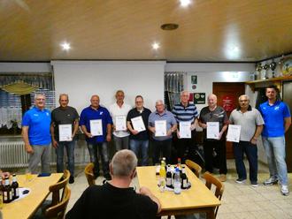 Die anwesenden geehrten Mitglieder eingerahmt durch die Vorstaände Hans Dorn und Marcel Schulz. In der Mitte Klaus Jost (Ehrenmitglied) der für die 70-jährige Mitgliedschaft geehrt wurde