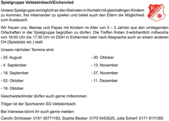 Wir freuen uns, Mamas und Papas mit Kindern im Alter von 0 – 3 Jahren aus den umliegenden Ortschaften in der Spielgruppe begrüßen zu dürfen. Die Treffen finden 2-wöchentlich mittwochs von 16:00 Uhr bis 17:30 Uhr im DGH in Eichenried oder nach Absprache auch an einem anderen Ort (Spielplatz etc.) statt.