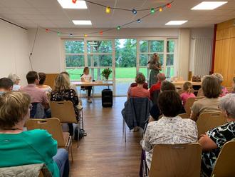 Über 40 Gäste waren der Einladung der Bücherei Mittelkalbach gefolgt. Was als sommerliche Open Air Lesung geplant war, musste aufgrund des schlechten Wetters kurzfristig ins Bürgerhaus verlegt werden. Mit hausgemachten Limonaden oder Cocktails und mit Snacks versorgt machten es sich die Gäste im Clubraum bequem.