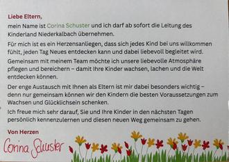 mein Name ist Corina Schuster und ich darf ab sofort die Leitung des Kinderland Niederkalbach übernehmen.