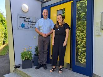 Bürgermeister Mark Bagus und Kita-Leitung Corina Schuster