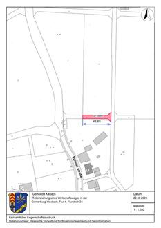 Die Gemeinde Kalbach beabsichtigt, die Teileinziehung eines Wirtschaftsweg in der Gemarkung Heubach, Flur: 4, Flurstück: 24, (Gesamtgröße 454 m²), Lage „Auf dem Bielfeld“, mit einer Teillänge von ca. 43 m und einer Teilfläche: ca. 260 m² einzuziehen. Die genaue Lage des Weges ist dem nachstehenden Planauszug zu entnehmen.