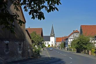 Bei der 38. Auflage des Wettbewerbs „Unser Dorf hat Zukunft“ geht Großenmoor als eins von zehn Dörfern im Landkreis Fulda ins Rennen. Die Jury reist am 10. September dorthin. Das Foto zeigt die Talstraße in Großenmoor mit Blick auf die zwischen 1923 und 1926 gebaute evangelische Kirche. Foto: Karl-Heinz Burkhardt (Kostenfreier Abdruck des Fotos bei Nennung der Fotoquelle.) Anbei auch das neue Logo des Wettbewerbs sowie das Banner, das in jedem teilnehmenden Dorf auf den Wettbewerb hinweist.