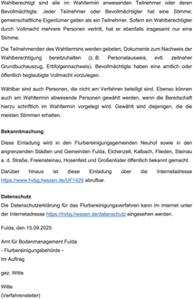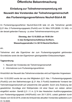 Diese Einladung wird in den Flurbereinigungsgemeinden Neuhof sowie in den angrenzenden Städten und Gemeinden Fulda, Eichenzell, Kalbach, Flieden, Steinau a. d. Straße, Freiensteinau, Hosenfeld und Großenlüder öffentlich bekannt gemacht.