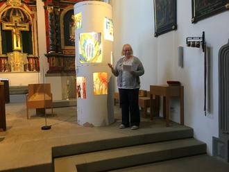 Nach dem Gottesdienst zeigte die Künstlerin Doris Hopf ihre Ausstellung in zwei Litfaßsäulen vor und erläuterte ein Bild mit dem Text: