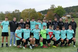 Die siegreiche Mannschaft mit den Spielern Paul Kimpel, Bastian Muth und Thore Eldner von der SG Oberkalbach, sowie Yannis Hahn aus Uttrichshausen, sowie dem Trainerduo Andreas Muth und Fabian Lamp von der SG Oberkalbach