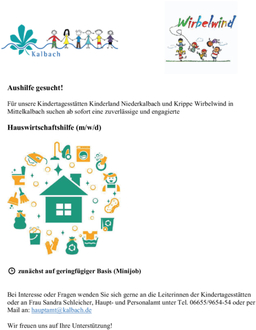 Bei Interesse oder Fragen wenden Sie sich gerne an die Leiterinnen der Kindertagesstätten oder an Frau Sandra Schleicher, Haupt- und Personalamt unter Tel. 06655/9654-54 oder per Mail an: hauptamt@kalbach.de