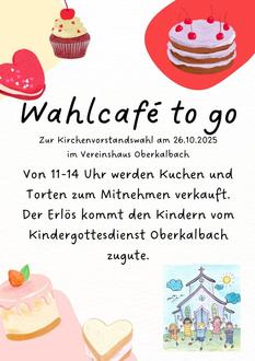 Es findet ein Wahlcafé statt. Der Kirchenvorstand lädt bei Kaffee und Kuchen zum verweilen, oder um ein kleines Schwätzchen zu halten ein. Gerne kann auch Kuchen mit nach Hause genommen werden.