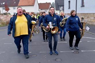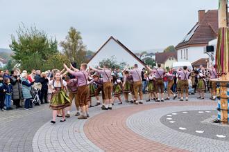 Dann kam wie jedes Jahr der große Moment des Kirmestroubadours Benedict Reck, der mit seinem Tamburin die 17 Paare der Niederkalbacher Karnevalsgesellschaft in ihre Arena um den Kirmesbaum führte.