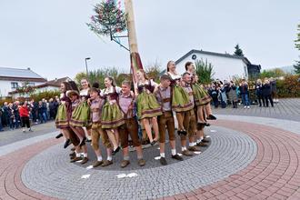 Nach dem sonntäglichen Kirchgang zog der gesamte Kirmeszug sprichwörtlich mit Pauken und Trompeten vom Mitteldorf hinauf zum Kirmesplatz. Dieser war in Erwartung des Kommenden bereits gut gefüllt. Unter die vielen Gäste mischten sich auch Kalbachs Bürgermeister Mark Bagus, der 1. Beigeordnete Markus Hackenberg sowie Landrat Bernd Woide. Zunächst tanzten die Kinder des Niederkalbacher Kindergartens mit ihren Erzieherinnen liebevoll einstudierte Tänze um den Kirmesbaum, die von den Eltern, Omas und Opas begeistert beklatscht wurden. Laola-Wellen, angeführt von Bürgermeister Mak Bagus, schlossen sich an.