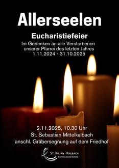Am 2. November, am Allerseelentag, findet um 10.30 Uhr ein Gedenkgottesdienst in der St. Sebastiankirche für die Verstorbenen der letzten 12 Monate statt. In dieser Eucharistiefeier möchten wir in besonderer Weise den Verstorbenen gedenken. Eine Kerze mit dem Namen und dem Sterbedatum wird an der Osterkerze als Zeichen der Auferstehung angezündet und vor den Altar aufgestellt. Am Ende der Heiligen Messe können sich die Angehörigen diese besondere Kerze vor dem Altar abholen und mit nach Hause nehmen.