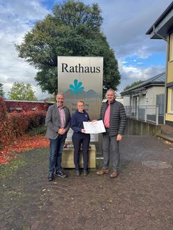 v. l. Bürgermeister Mark Bagus, Julia van Scheven (FFW Veitsteinbach-Eichenried), Michael Larbig (SparkassenVersicherung)