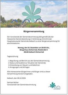 Der Vorsitzende der Gemeindevertretung lädt gemäß § 8a der Hessischen Gemeindeordnung in Verbindung mit § 8 (1) der Hauptsatzung der Gemeinde Kalbach zu einer Bürgerversammlung für alle Ortsteile ein.