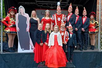 Die Menge freute sich riesig und feierte die neuen Kinderregenten unter großem Applaus. Doch wer regiert wohl die großen Narren in dieser Kampagne? Ob in dem Fahrzeug wohl noch mehr wertvolle Fracht untergebracht war? Die Überraschung war gelungen: Aus dem Auto entstiegen Prinz Adrian LVIII., „als Adliger vom Petersberg gekommen, hat er das Zepter in Kalbach übernommen” und an seiner Seite seine Lieblichkeit Prinzessin Lea XLVI., „von Gesundheit, Tanz und Feinschliff-Glanz”, begleitet von ihren Adjutanten Nils (Wehner), Jan (Staubach) und Tim (Staubach), Rosalie (Klein) und in besonderer Form Tessa (Wehner).