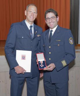 Als letzte Verleihung stand eine außergewöhnliche Ehrung an. Für seine besonderen Verdienste um den Brandschutz und seine langjährige Tätigkeit als Kreisausbilder wurde mit dem Silbernen Brandschutzverdienstzeichen ausgezeichnet: