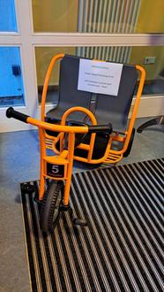 Die Kinder der Kita St. Sebastian freuen sich über das neue Doppeltaxi in orange, auf dem bis zu drei Kinder Platz finden.