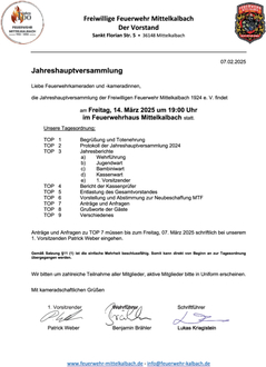 die Jahreshauptversammlung der Freiwilligen Feuerwehr Mittelkalbach 1924 e. V. findet
