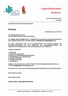 Zu dieser Versammlung lade ich die Jugendfeuerwehren der Gemeinde Kalbach, den Gemeindebrandinspektor und seine Stellvertreter, den Kreisjugendfeuerwehrwart, die Wehrführer und ihre Stellvertreter, sowie den Bürgermeister recht herzlich ein.