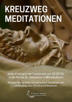 Sie sind herzlich dazu eingeladen, jeden Freitag in der Fastenzeit in die Kirche St. Sebastian in Mittelkalbach, 18.00 Uhr, eine Kreuzweg-Mediation mit Impulsen auf sich wirken zu lassen. Kommen Sie zur Ruhe und betrachten Sie mit uns den Leidensweg Jesu Christi in 14 Stationen.
