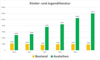 Besonders stolz sind wir auf die Zahlen im Kinder- und Jugendbereich. Hier haben sich die Ausleihen in den letzten 5 Jahren verdoppelt. Wir sind froh, dass wir mit unserem Bücherangebot und unseren Veranstaltungen für Kinder zur Lesemotivation der jungen Kalbacherinnen und Kalbachern beitragen.