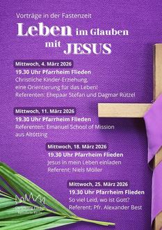 Wir laden Sie ein am Sonntag, 22. März 2026, 13.30 Uhr, im Anschluss an das Fastenessen, vor dem Bürgerhaus den Kreuzweg gemeinsam im Gebet zu begehen. Die Stationstafeln bleiben, bis Ostern stehen, somit besteht für jeden die weitere Möglichkeit den Kreuzweg auf seine ganz persönliche Weise und zu beliebiger Zeit beten zu können.