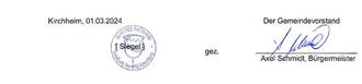 Es wird bestätigt, dass der Inhalt dieser Satzung mit dem/n hierzu ergangenen Beschluss/Beschlüssen der Gemeindevertretung übereinstimmt und dass die für die Rechtswirksamkeit maßgebenden Verfahrensvorschriften eingehalten wurden.