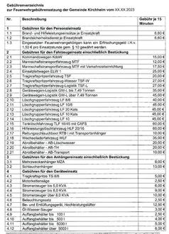 | (1) | Für Leistungen der Feuerwehr, die nach dieser Satzung erbracht werden, gilt nachfolgendes Gebührenverzeichnis, welches als Anlage Bestandteil dieser Satzung ist. |