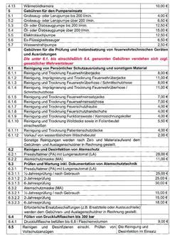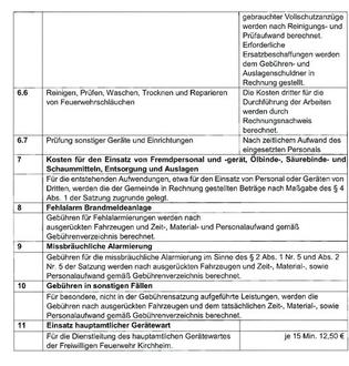| Die Höhe der Gebühr errechnet sich nach der aufgewendeten Zeit und dem eingesetzten Material, nach Art und Anzahl des eingesetzten Personals, der Fahrzeuge und Geräte sowie der zu prüfenden Geräte und Einrichtungen. |