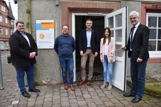 René Bieber (Geschäftsführer Kommunales Jobcenter), A³-Projektleiter Michael Blüm, Erster Kreisbeigeordneter Dirk Noll, Social Coach Carina Bittner und Landrat Torsten Warnecke vor den Räumlichkeiten des Projekts in Rotenburg.