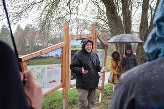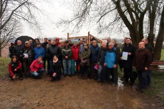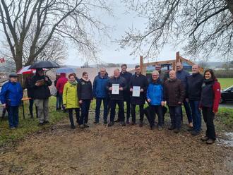 Wegepat*innen, Bürgermeister und Vertreter*innen der 10 Kommunen, das Naturpark-Team, das Team des Rotkäppchenlands und Jochen Becker vom Deutschen Wandersinstitut freuen sich trotz des strömenden Regens über die Zertifikate „Premiumwanderwege“ und „Premiumspazierwanderwege“ für die 20 Fabelwege im Naturpark Knüll © Jannes Löwer